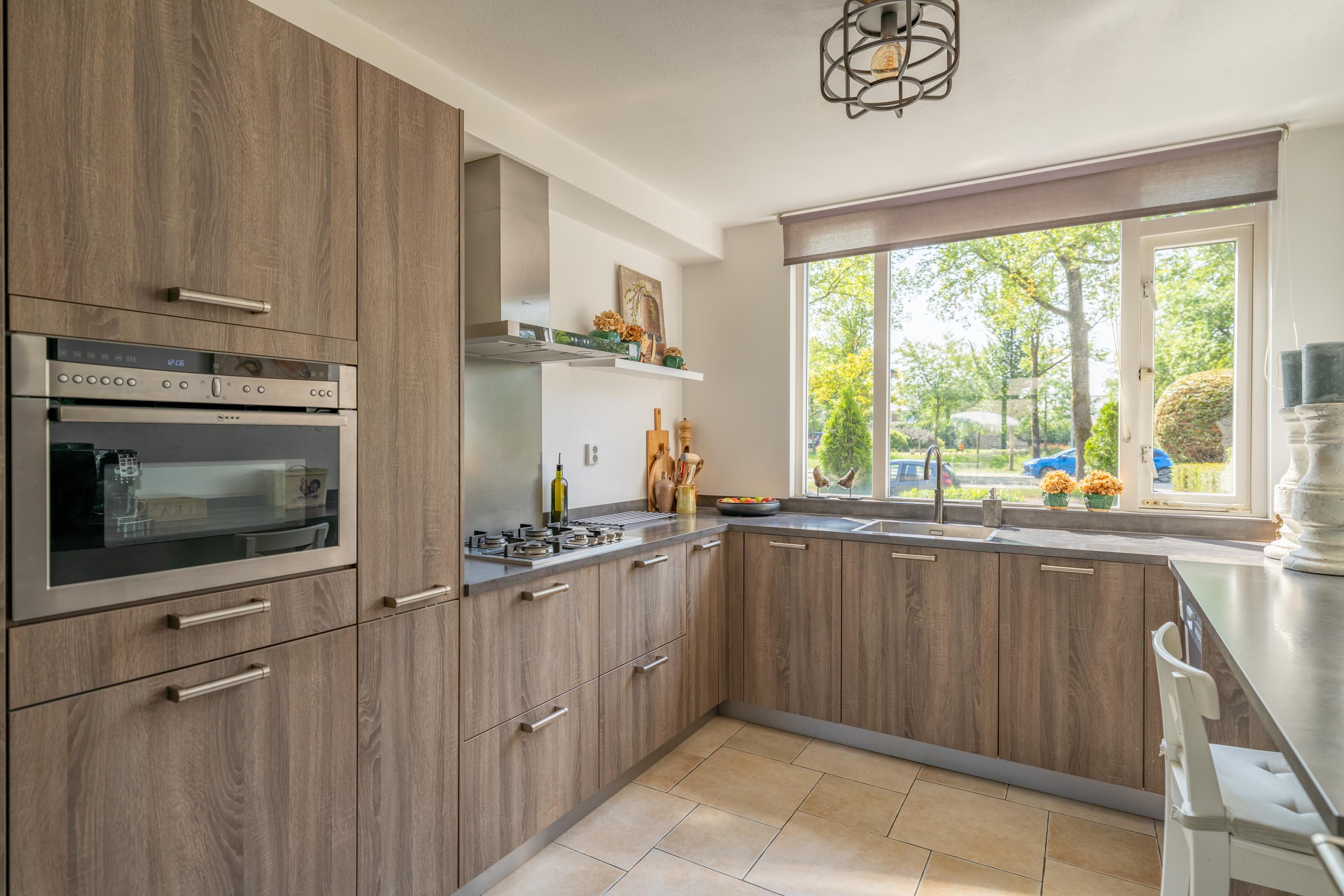 Entree met hal, toilet met fonteintje, trapkast en meterkast. Aan de voorzijde bevindt zich de moderne Kloosterman-keuken (2013) met diverse inbouwapparatuur, waaronder een gaskookplaat, afzuigkap, combi-oven (NEFF), koel-/vriescombinatie (Liebherr), Quooker en vaatwasser (Bosch). De tuingerichte woonkamer is heerlijk licht en sfeervol door de open haard. De begane grond is voorzien van vloerverwarming. Aan de voorzijde is een elektrisch zonnescherm aanwezig.