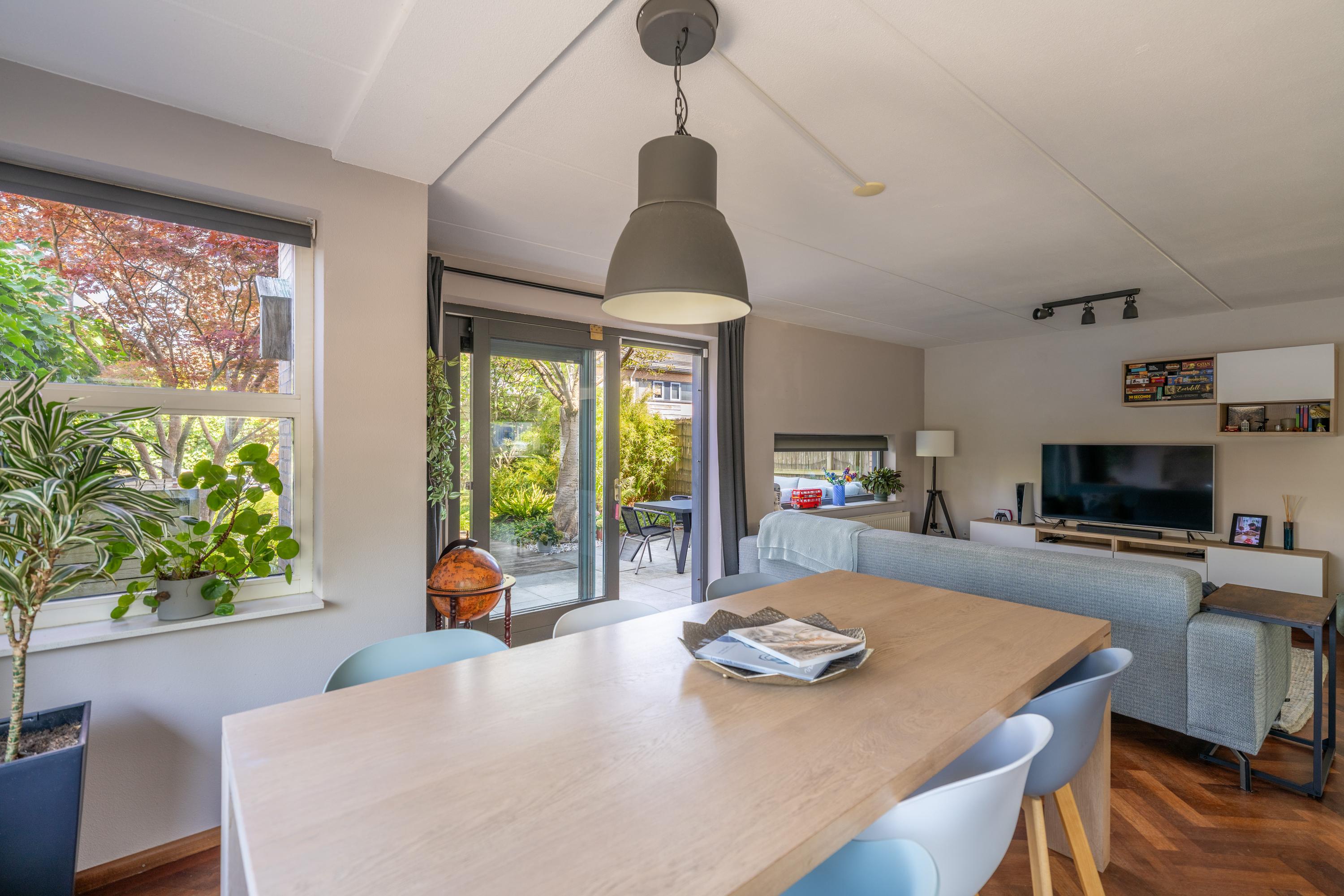 Indeling Begane grond Entree/hal met meterkast, trapopgang (2024) en toilet met fonteintje (2020). De ruime L-vormige woonkamer is voorzien van een stijlvolle visgraat parketvloer en dankzij de schuifpui staat de living in directe verbinding met de prachtig onder architectuur aangelegde tuin. Extra licht en ruimte ervaar je door de uitbouw aan de zijkant. Verder is er een praktische trapkast aanwezig.