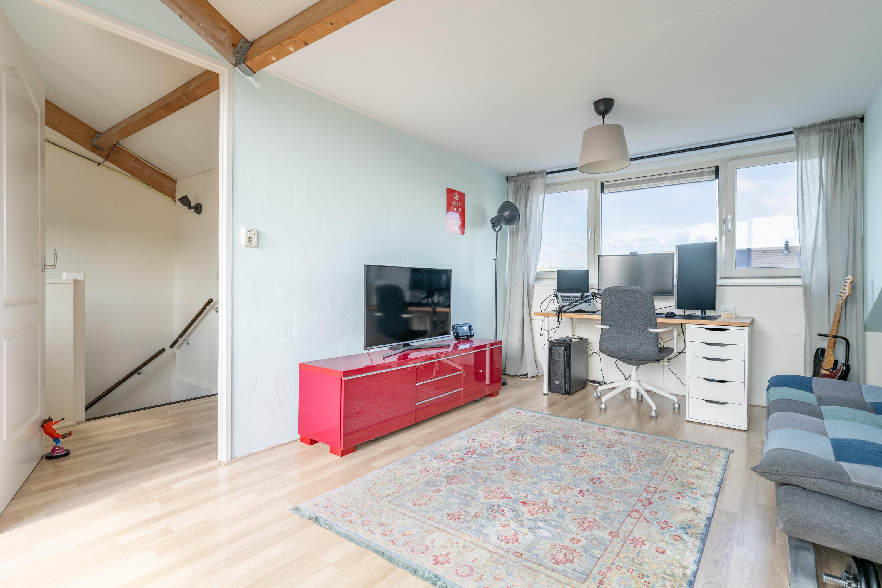 Tweede verdieping Vaste trap naar de zolderverdieping. Hier vind je een portaal met bergruimte en aansluitingen voor de wasmachine/droger, evenals de mechanische ventilatie-unit (2020). Verder een ruime derde slaapkamer met laminaatvloer, een grote dakkapel en toegang tot het dakterras over de gehele breedte van de woning.